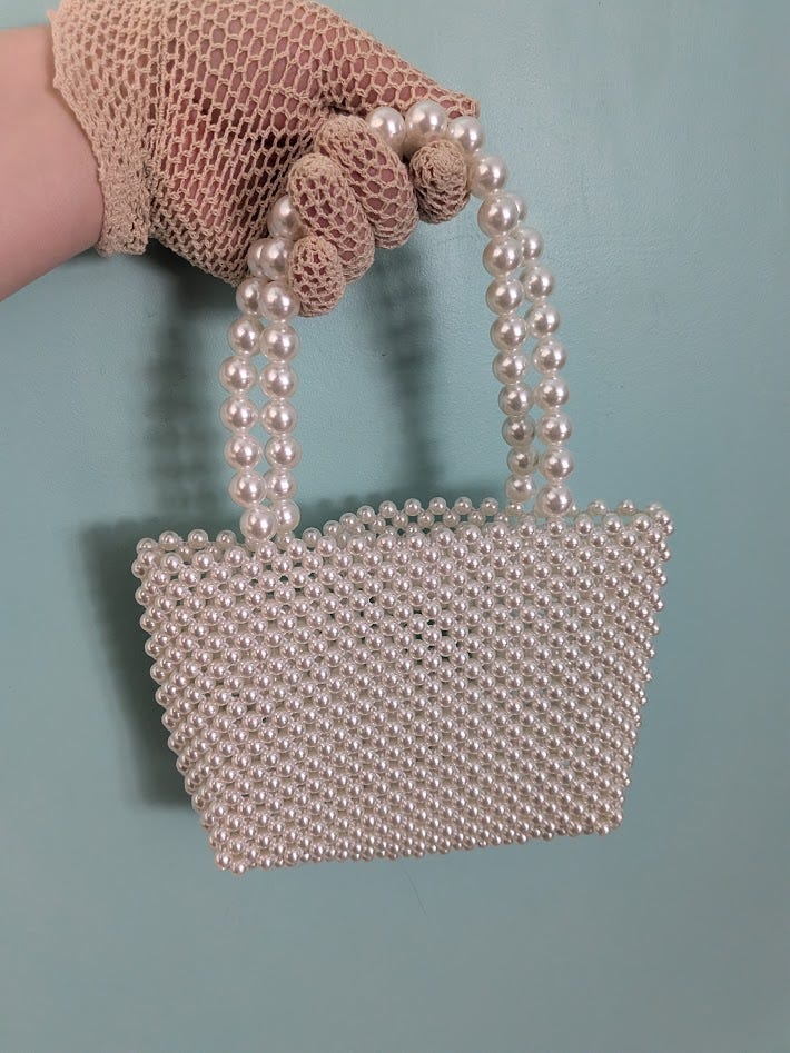 Or this outrageously impractical pearl purse I thrifted for a mere six bucks. Don’t ask me when or where I’ll use it, right now it makes fabulous wall décor!