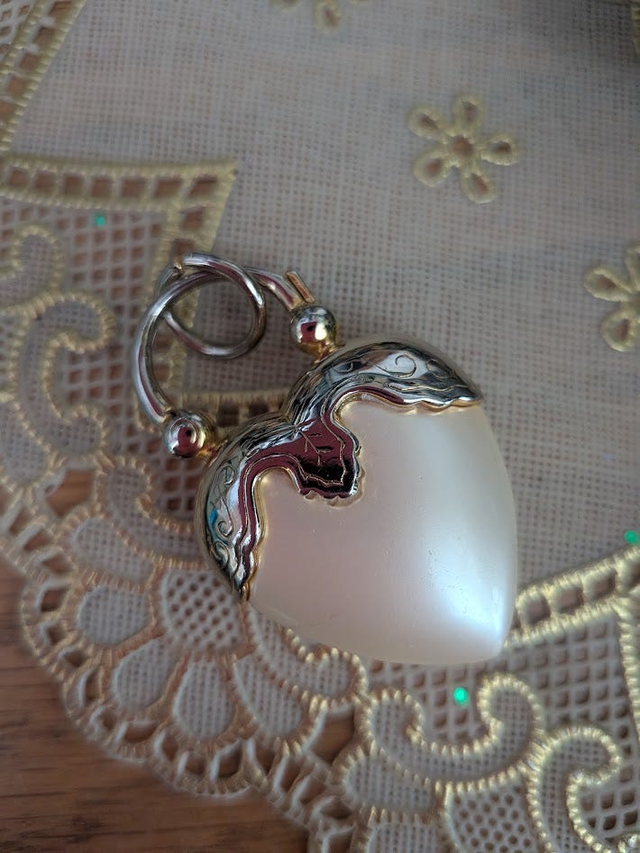 In my own thrifting adventures, I’ve found several faux pearl beauties. After rummaging through a questionably grody glass bowl of pins that I feared might give me tetanus, I discovered this vintage Joan Rivers heart in the mix. Though slightly scuffed on one side, I could not leave this incredible one dollar beauty behind.