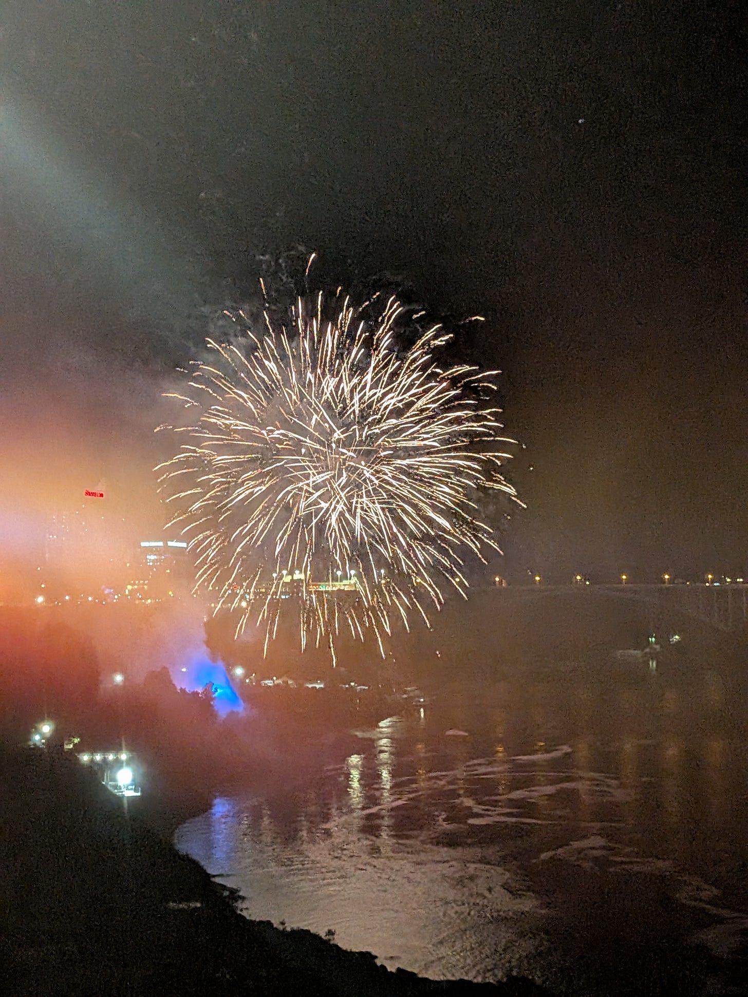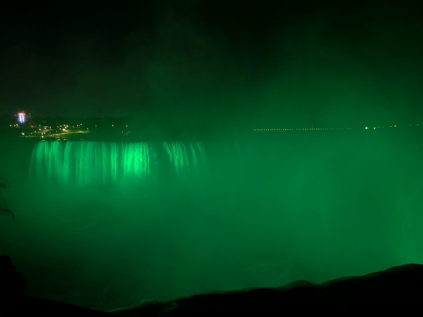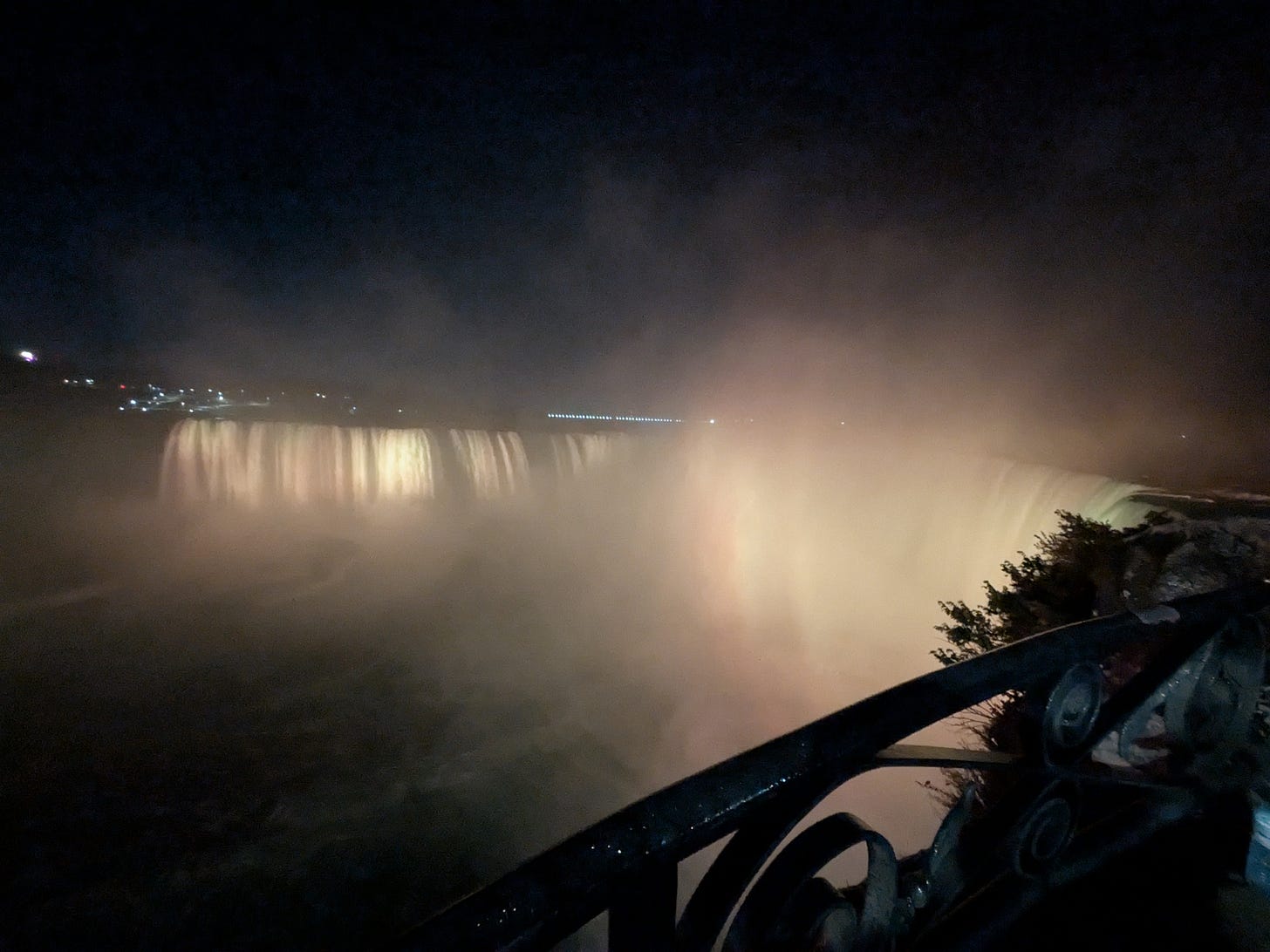But do you dare to move your feet a little closer into the zone of relentless back spray from Niagara Falls, puny human? You will shiver against glistening-wet iron railings just to catch a wider glimpse of its veiled beauty lit up against evening skies . . .