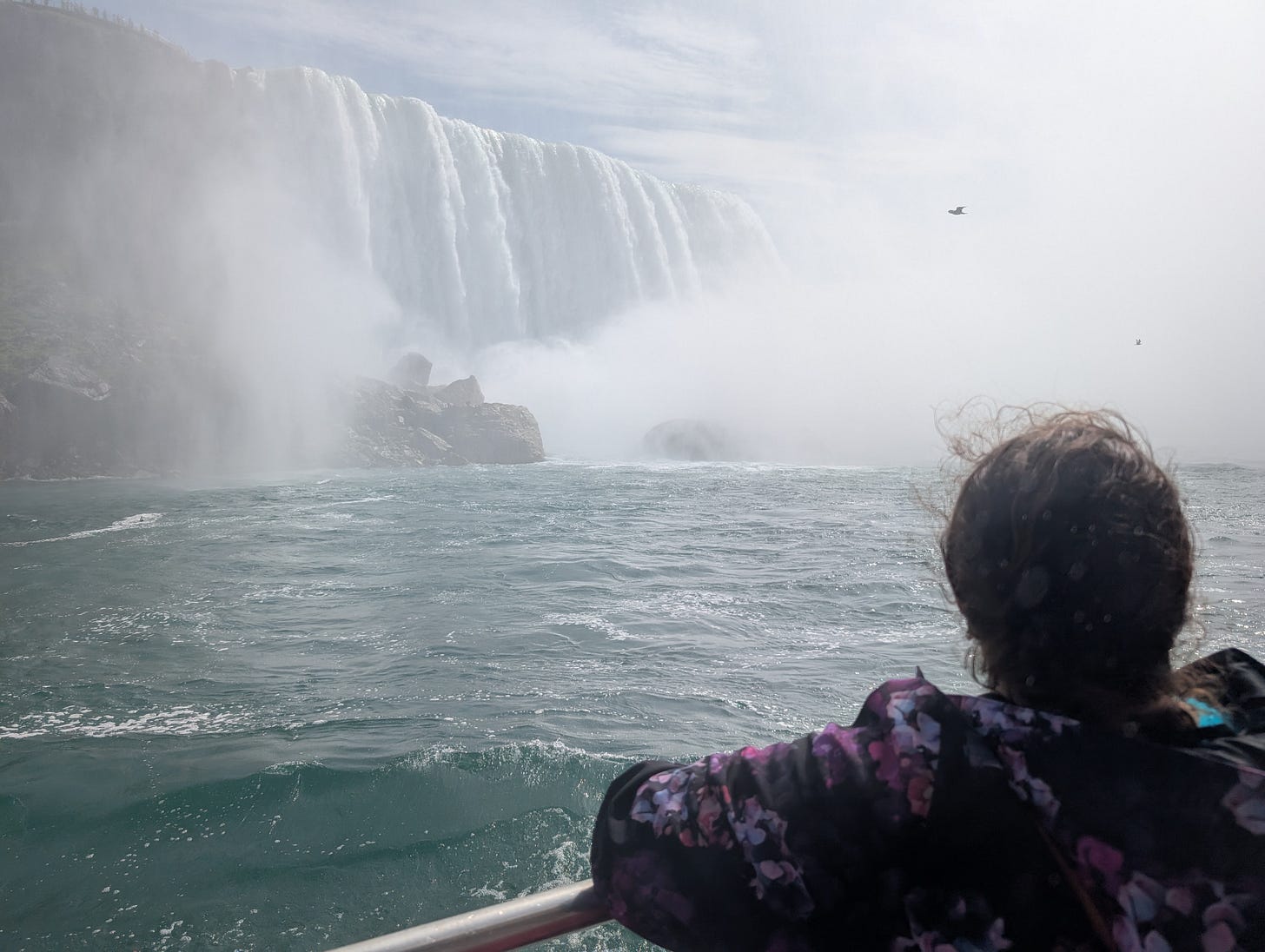 I must confess that the silver thunder of the falls mesmerized me, drowning out my noisy consciousness. And I was grateful for that. The wind coming off the falls blew sideways and pummeled my ears, almost driving through my skull like an invisible spear. Still, I pressed eagerly against the ferry’s railing—