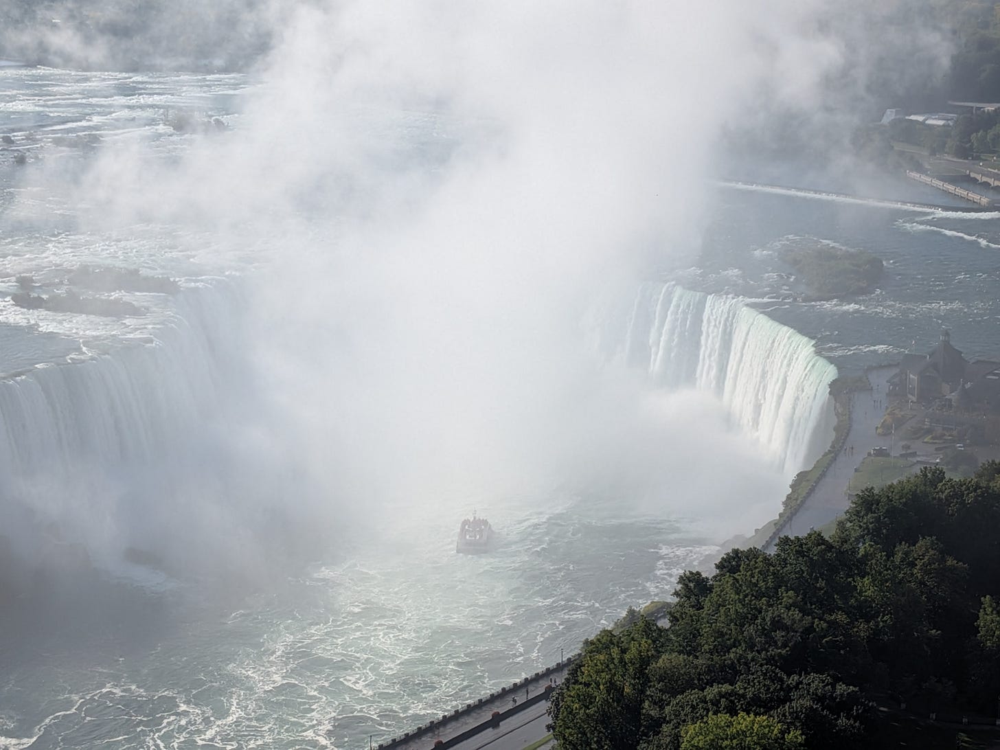 Or, for a different panorama, ascend the Skylon Tower and peer down at the ferries bobbing like tiny toy ships in the fierce currents of the falls . . .